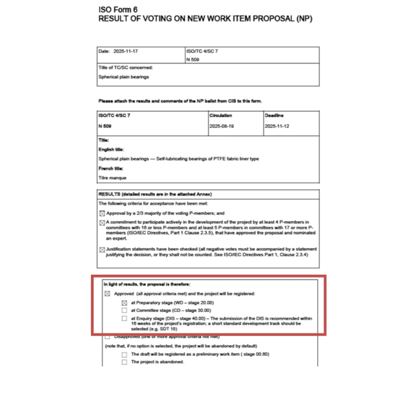 近日,由龙轴集团主导的ISO/NP 25994:Spherical plain bearings-self-lubricating bearings of PTFE fabric liner type(《关节轴承 PTFE织物衬垫型自润滑轴承》)国际标准提案,经过ISO/TC4/SC7组织的新工作项目提案(NP)投票环节,已正式获批立项,进入正式起草阶段。这是我国牵头立项成功的首份自润滑轴承国际标准,同时也是全球首份针对PTFE织物衬垫型自润滑轴承的产品标准,标志着我国在自润滑轴承高端技术领域实现了从“技术跟随”到“标准引领”的历史性突破,具有里程碑的标志性意义。