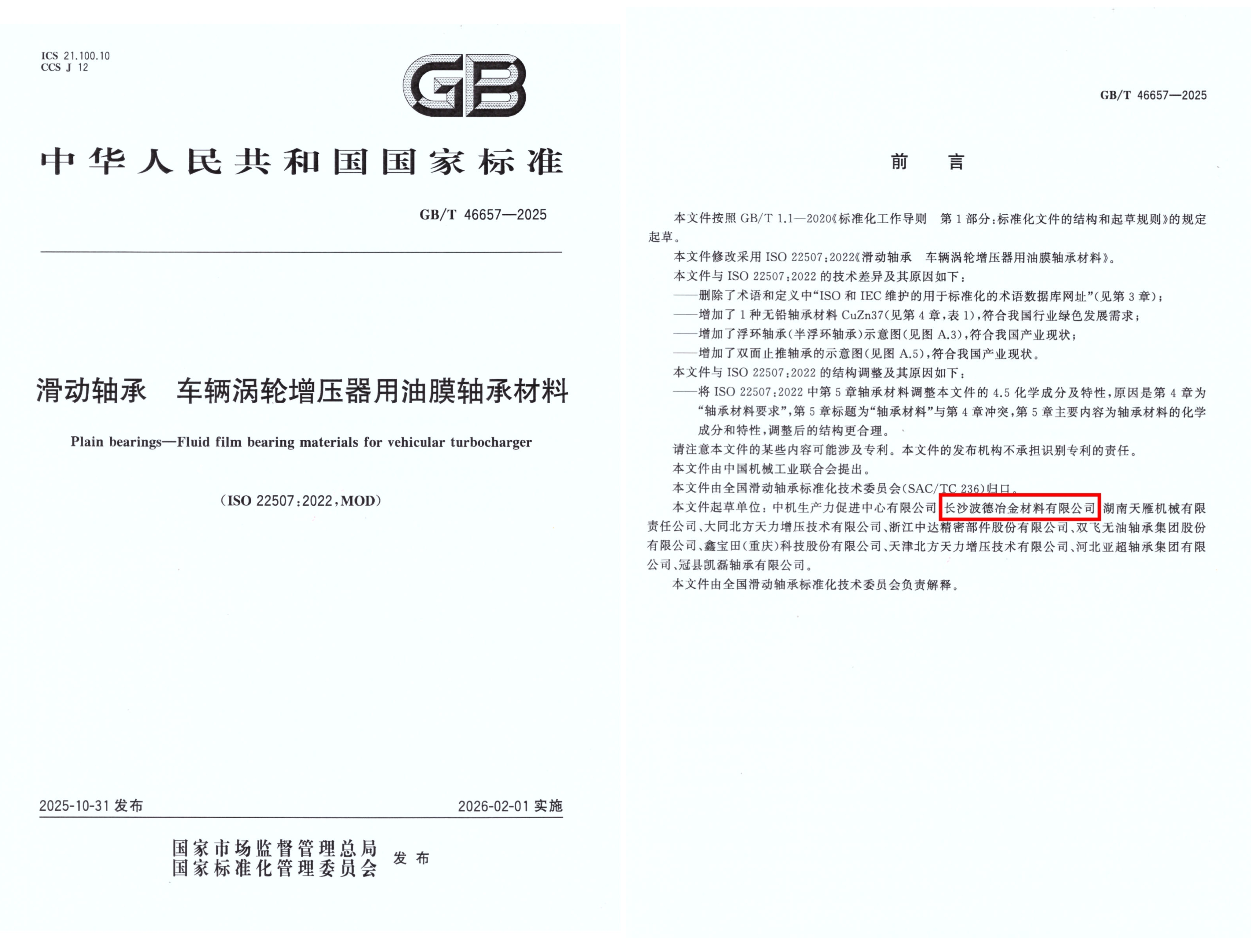 国家市场监督管理总局、国家标准化管理委员会正式批准发布的国家推荐性标准GB/T 46657-2025《滑动轴承 车辆涡轮增压器用油膜轴承材料》将于近期正式实施,龙轴集团权属企业长沙波德公司作为主要起草单位(排名第二),联合国内车辆涡轮增压器及油膜轴承材料相关生产企业共同起草该标准。