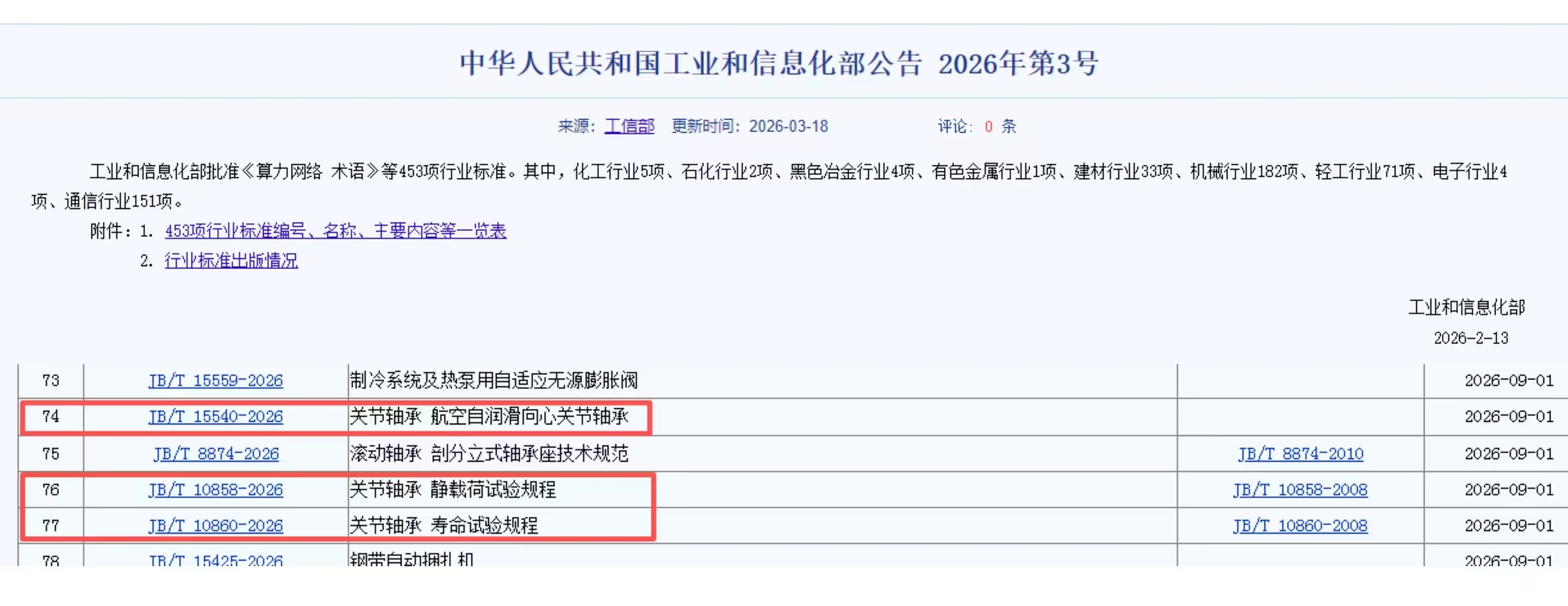 2026年2月13日,经工信部批准,由龙轴集团主导制定的《关节轴承 航空自润滑向心关节轴承》(JB/T 15540-2026)标准正式发布,这是我国机械行业首份针对航空自润滑向心关节轴承的行业标准,标志着我国在高端航空轴承领域的技术实力与标准话语权迈上新台阶。